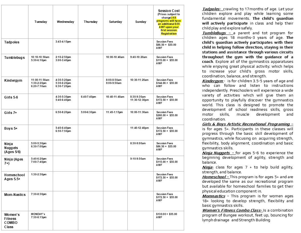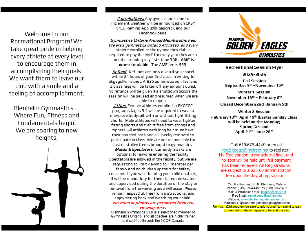Register by calling 519-676-4449 to reserve your spot! Payment due Via Etransfer to [email protected] at the time of registration in order to hold your spot! All registrations are subject to a $25.00 administration fee at the time of registration and is non-refundable, should you wish to cancel your registration at any time after registering new and or returning members. All new members must pay the Gymnastics Ontario Membership fee 1 time per year in the year running July 1st-June 30th which is also non-refundable.